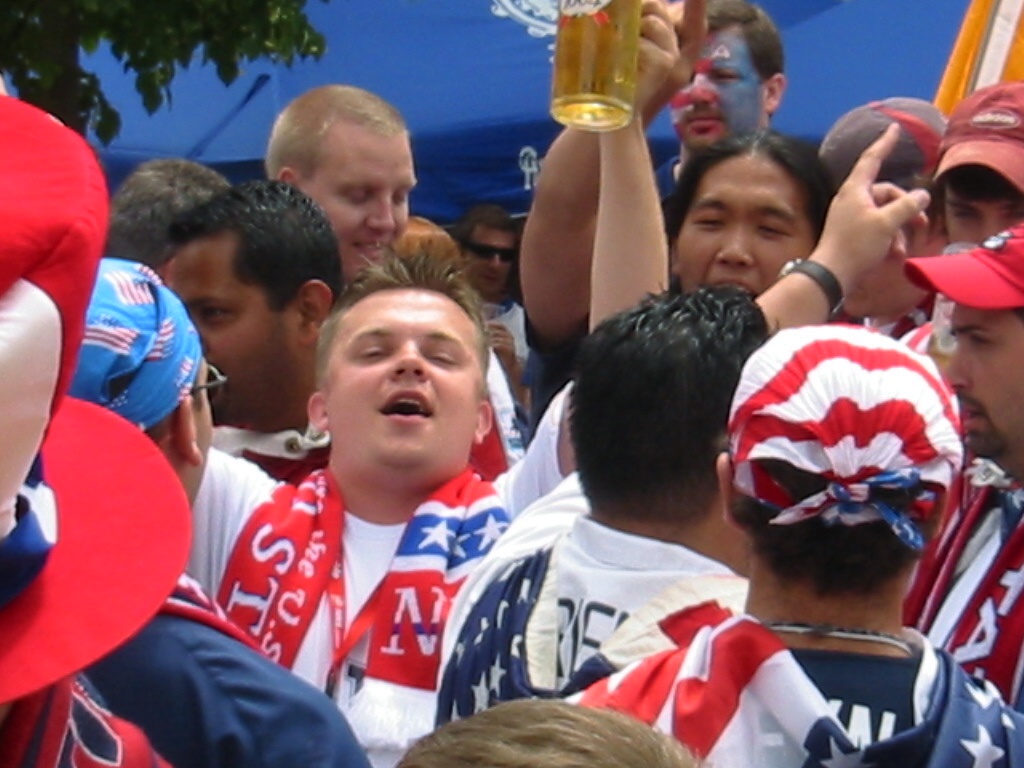 We stuck around this time and didn't head early to stadium. We left with the ALL of the fans at the same time marching up the street toward the train station. Nürnberg had no clue what hit them. We stopped the automobiles dead in their tracks as we marched all around them beating drums, waving flags and singing our songs. All the locals and shop owners came out taking pictures of the spectacle of the impromptu parade they were witnessing. Crazy American soccer fans in Germany .... to quote Brent "Who knew?" We continued the march making noise, all the way down the escalator ... into the train station ... through the train station ... onto the platform ...on the train...off the train...all the way to the stadium. It was quite the site to see and I'm sure like everyone else, one of their fondest memories of the 2006 World Cup.