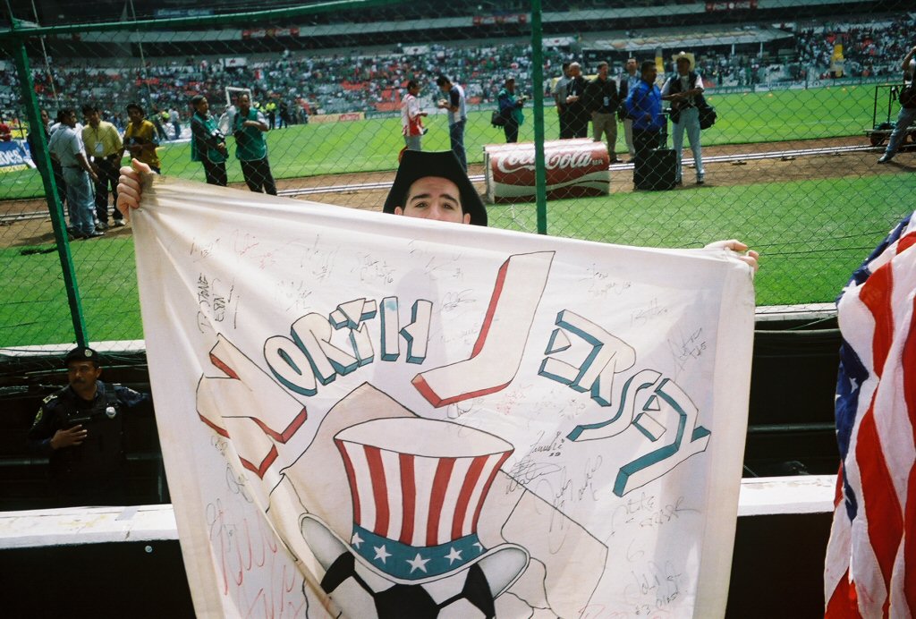 Some random things I'll remember from the game. Every time Mexico scored, the Mexican beer guy running down the first aisle pumping his fists. Brent selling out and doing an interview for Outside the Lines during the game. The father who broke his nose and lip to get his son a Corona ball. I was going to give it to your son anyway. Joe trading his American bandana for a Mexican flag and starting an exchange of gifts between the two fans. Joe's such a diplomat. Sansone getting that crazy Mexican hat.