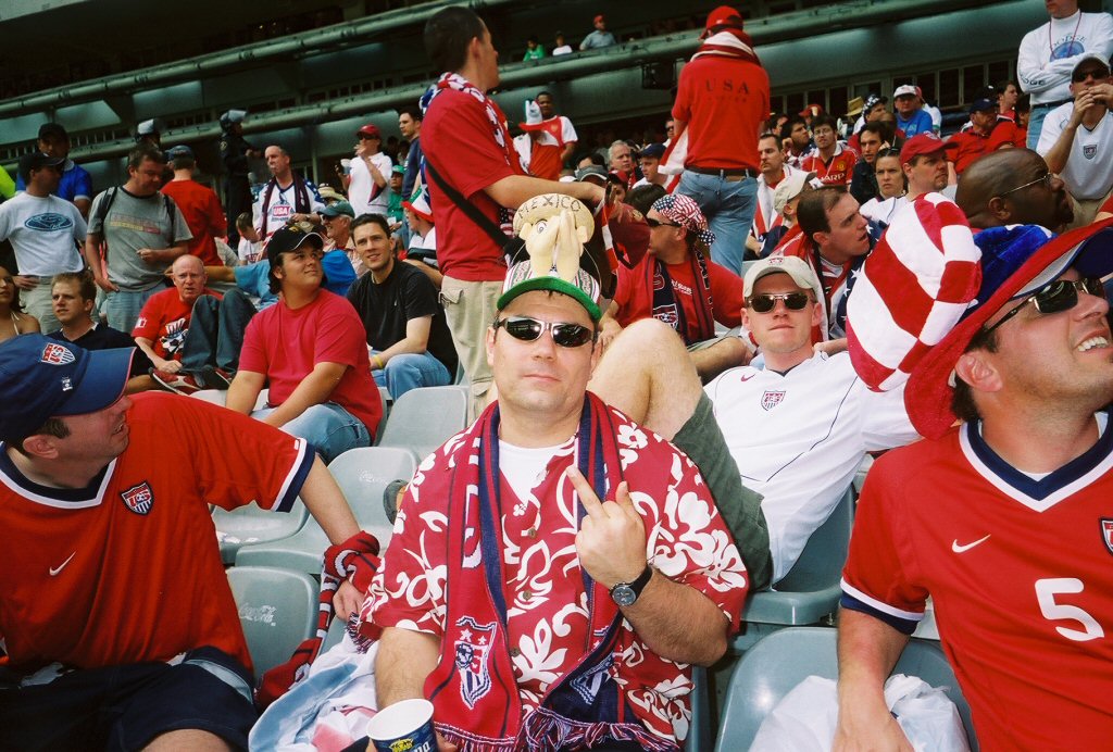 The US came out with a slight different formation and more legs to start the second half. Eddie Lewis had a good chance early that was saved by the keeper. If we could just get one back early...who knows what could happen. Then in the 58th minute a good sequence out wide, saw the ball finds its way to Donovan and he laid it off for Eddie Lewis. He fired a low screamer weaving between the defenders and the post. GOAL! - our first in 20 years AND let the shower begin. As soon as Lewis scored, the place went dead and beer began flying over at us. Luckily for most of us, we had the 20 x 30ft flag over us so most of the beer shower landed on the flag. We now had almost 20 minutes to score another but we just couldn't seem to generate any more offense. Kasey Keller did an amazing job at keeping it a one goal game. I'm not sure why Clint Mathis wasn't in Mexico City but he was sorely missed. His insertion for Claudio I am certain would have meant a tying goal. The way we were playing, our goal would to have come from out of nowhere and no one is better than Clint at that. As time kept ticking off, the final whistle sounded: 2-1 Mexico. "The Giant is Not Dead" one banner proclaimed from the stands.